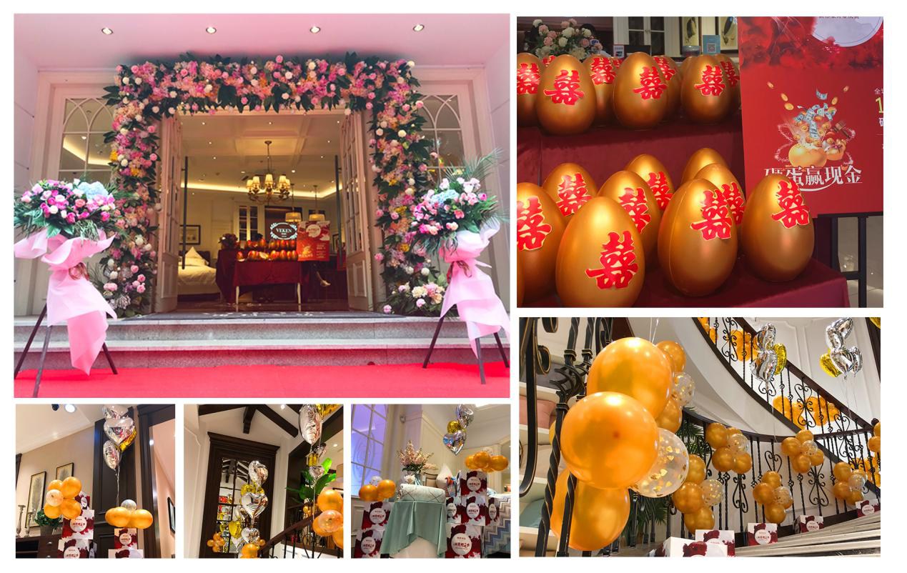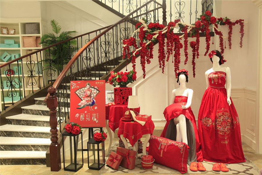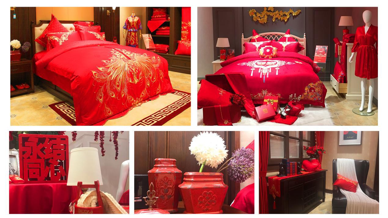 為帶給顧客更直觀舒適的消費(fèi)體驗(yàn),在空間設(shè)計(jì)上,維科家紡和義店二樓婚慶家紡場(chǎng)景展示區(qū)摒棄了家紡行業(yè)傳統(tǒng)高柜+展床的方式,將300余平的空間分隔成7個(gè)實(shí)景樣板間,真實(shí)體現(xiàn)婚慶床品在日常家居生活中的效果,也能滿足顧客在選購(gòu)婚慶床品的同時(shí),一站式解決對(duì)婆婆禮、長(zhǎng)輩禮以及婚慶小件(子孫桶、火銃、虎頭鞋等)的需求。由于該創(chuàng)意目前在家紡行業(yè)中應(yīng)用較少,可借鑒之處寥寥無(wú)幾,公司各部門(mén)投入了大量的時(shí)間精力不斷對(duì)方案進(jìn)行修改,力求盡善盡美。整個(gè)二樓還設(shè)置了一大一小兩個(gè)洽談區(qū),都配備了舒適的沙發(fā)以及精致的茶歇,以供顧客能夠坐下來(lái)向?qū)з?gòu)詳細(xì)了解床品的信息。在陳列布置上,當(dāng)季新品醉紅妝、子孫滿堂、胭脂醉,熱銷(xiāo)品百子納福、麒麟賀滿堂等都被直接鋪設(shè)于房間內(nèi),并搭配生活化的情景道具,供顧客選購(gòu)。