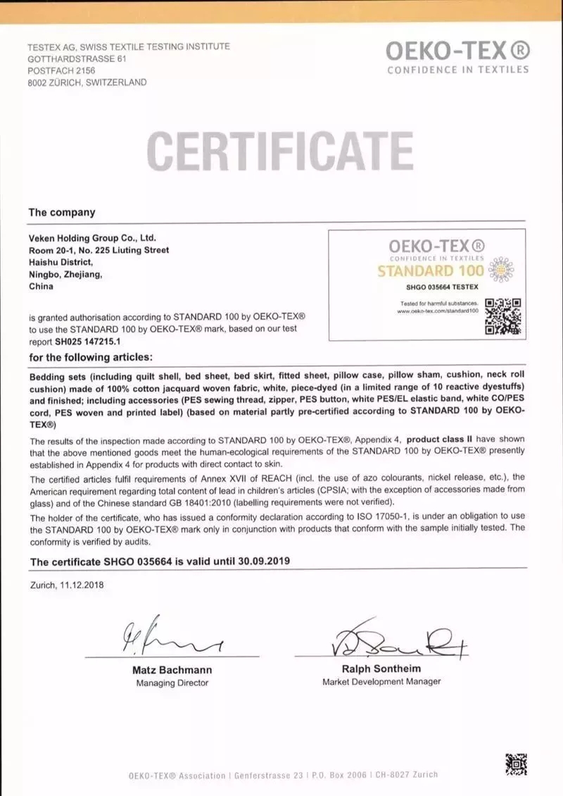 該證書(shū)標(biāo)簽適用產(chǎn)品為:床上用品(被套、床單、床圍、靠墊套、護(hù)頸套)由白色、經(jīng)匹染(染料的適用范圍僅限于已申報(bào)的10支活性染料)和后整理的全棉提花梭織面料制成;輔料包括(滌綸縫紉線、拉鏈、滌綸紐扣、白色滌綸/氨綸松緊帶、白色滌棉抽繩、滌綸織標(biāo)和印標(biāo))(部分使用有STANDARD 100 by OEKO-TEX證書(shū)的原材料)。