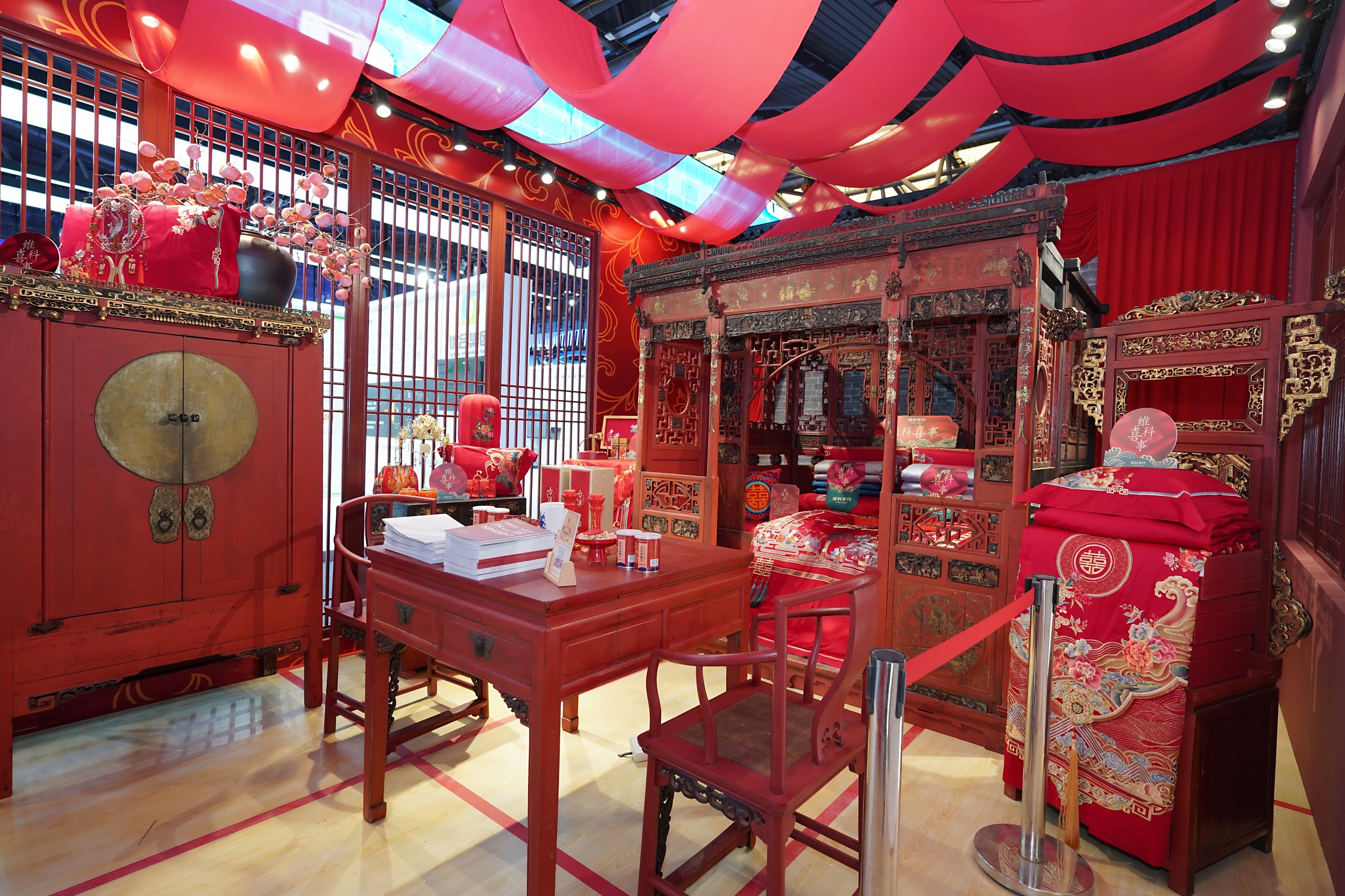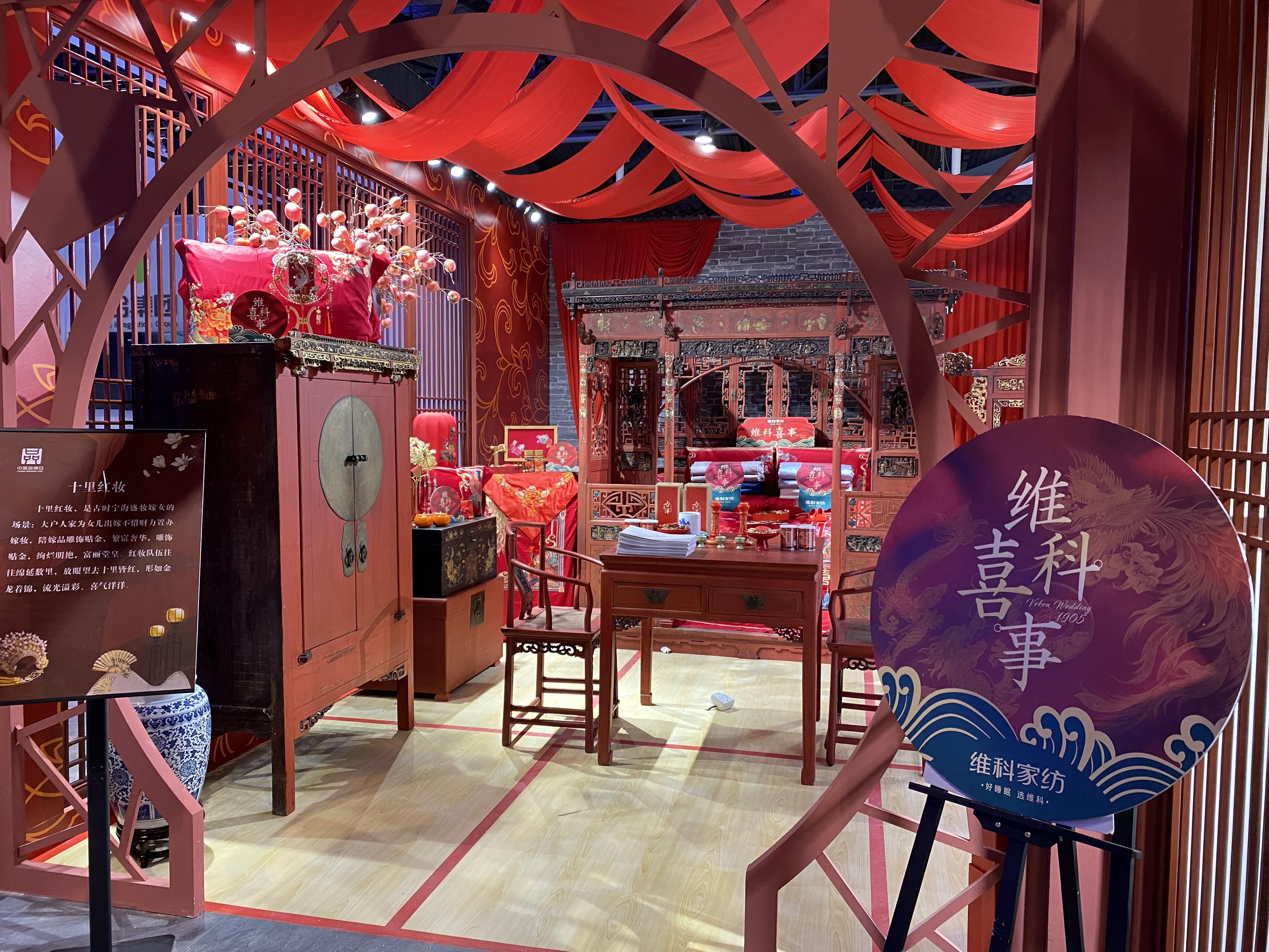 寧波發(fā)改委的相關(guān)負責人表示,由維科家紡精心打造的古代婚房是本次寧波館展廳的一大亮點。通過重工刺繡的婚慶套件【百子百?!俊君堈馒P彩】【錦繡年華】、華美的鳳冠喜扇等展品,結(jié)合收藏夾協(xié)會提供的長達兩百年歷史的古董家具,展現(xiàn)了濃厚的婚慶氛圍和傳統(tǒng)文化的精髓,將“十里紅妝”的獨特魅力展現(xiàn)得淋漓盡致。